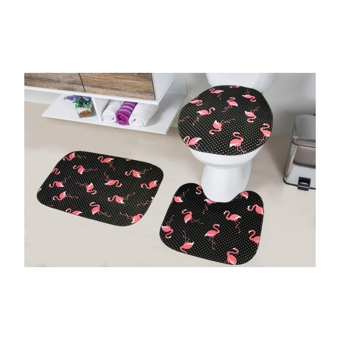 Jogo Tapetes para Banheiro Tecil Pop 3 Pecas Flamingo Preto