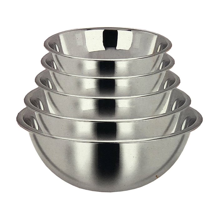 Jogo com 5 tigelas feitas em aço inox, um material que confere alta durabilidade, resistência, e não possui porosidades, o que evita o acúmulo de resíduos nos orifícios do utensílio e torna a sua limpeza muito fácil além de poder ir à lava louça.