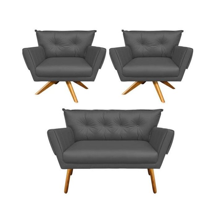 Kit 01 Namoradeira e 02 Poltronas Giratória Anitta Corino Base Madeira D'rossi - Grafite