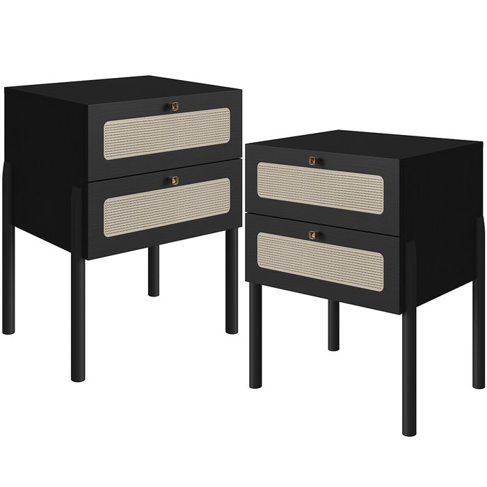 Kit 02 Mesas de Cabeceira 02 Gavetas com Telinha Pés Madeira Moss A03 Nero Preto - Lyam Decor