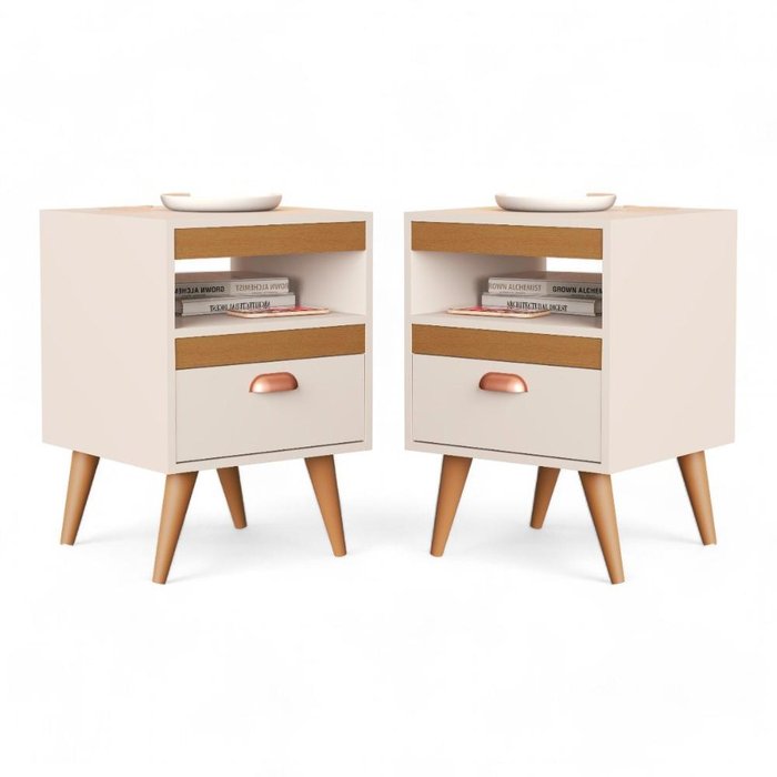 Cada mesa de cabeceira oferece espaço para seus itens essenciais, como livros, abajures e objetos, mantendo tudo ao seu alcance. Dimensões do Produto Montado: