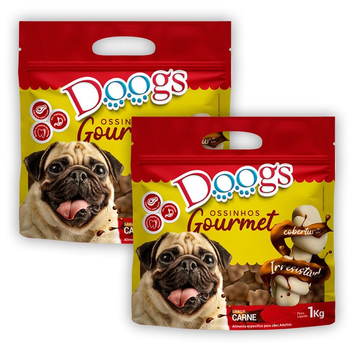IMPORTANTE: NÃO DÊ OSSOS DE RASPA DE COURO PARA SEU PET. AS LASCAS SÃO DURAS E NÃO DIGERE. PODE PERFURAR O SISTEMA DIGESTIVO. Seu melhor amigo merece O Melhor ossinho do Mercado. Osso nó. Pacote com zíper. 02 unidades de 1 Kg. Satisfaz a vontade de roer objetos, é perfeito para divertir, auxilia na manutenção da saúde bucal e limpeza dos dentes do seu cãozinho. Auxilia na manutenção da limpeza dos dentes. Possui alta digestibilidade. Petisco 100% vegetal, cobertura irresistível sabor carne. Alimento específico para cães adultos. Os Ossinhos Gourmet Doogs, sabor Carne, é um alimento específico para cães, muito saboroso, produzido com base em ingredientes vegetais, e com uma deliciosa cobertura de sabores incríveis que seu cão irá adorar. Além de nutro, pois sua base de ingredientes vegetais proporciona uma excelente digestibilidade ao produto, pode-se fornecer também em momentos de brincadeiras e até como prêmio por uma tarefa cumprida para seu cão, e ainda pode ser fornecido também para distrair se pet até evitando o estresse dos animais. Ainda auxilia a evitar acúmulos residuais de alimentos na dentição, pois durante a mastigação através do contato dos ossos nos dentes, esse atrito provocado possui esse efeito de limpeza. Os Ossinhos Gourmet Doogs sabor Carne satisfazem os paladares mais exigentes, dê par o seu pet e demostre todo o carinho que você tem por ele. Ele irá AMAR. Composição qualitativa: Farinha de trigo, água, hidrolisado de carne de frango, hidrolisado de fígado de frango, fécula de mandioca, sorbato de potássio, tripolifosfatos de sódio e eritorbato de sódio. Modo de usar: O produto apresenta-se pronto par ser usado. Os ossinhos podem ser oferecidos durante atividades de recreação, aprendizagem e treino. De o produto, a fim de estimular a atenção, aprendizagem e obediência com diversão. Distribuir a quantidade recomendada ao lindo do dia. Cães até 15 kg: 1 unidade por dia Cães acima de 15 kg: 2 unidades por dia Prazo de validade: 24 meses após a data de fabricação. Consumir em até 7 dias após aberto. Condições de conservação: Conservar em local seco, fresco e arejado, longe do alcance de raios solares diretos. Manter a embalagem sempre fechada e armazenar em local fresco e seco. Após a abertura, lacre novamente ou armazene em um recipiente hermético para melhor conservação. Restrições e outras recomendações: USO PROIBIDO NA ALIMENTAÇÃO DE RUMINANTES. Este produto não substitui o alimento completo. Produto não comestível para seres humanos. Lave completamente os utensílios usados para alimentação. Não deixe alimento umedecido no pote ou comedouro por muito tempo para evitar fermentação. Deixe sempre água fresca e limpa a disposição de seu animal, de preferência próxima ao alimento. Leve seu Pet regularmente ao Médico Veterinário e/ou consulte um Zootecnista.