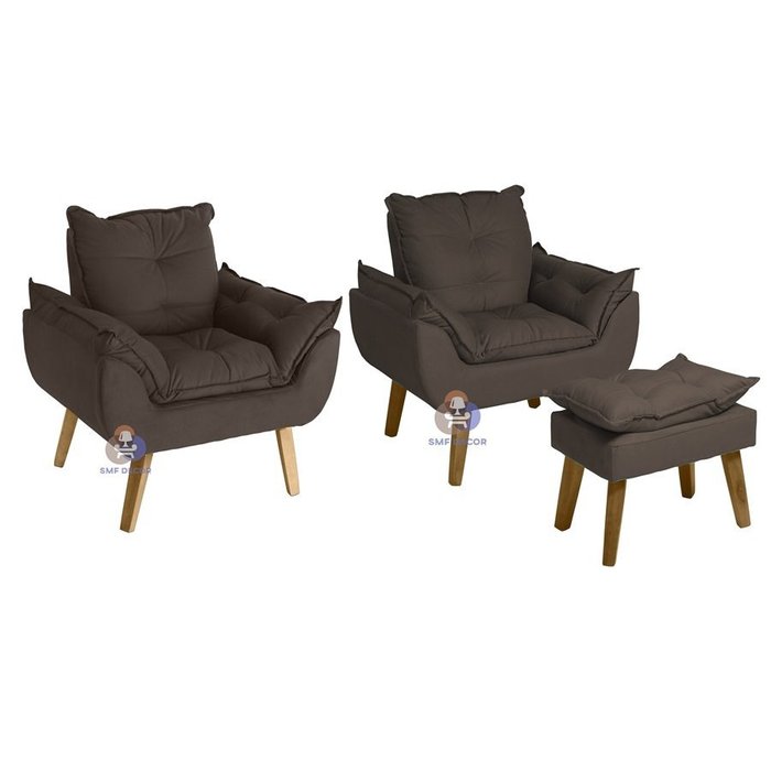 Kit 02 Poltrona/Cadeira Decorativa E Puff Glamour Marrom Com Pés Quadrado Marrom - Poltrona com Puff Marrom