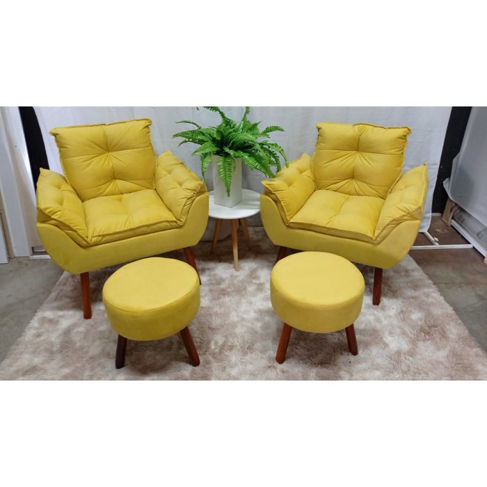 Kit 02 Poltrona Decorativa Opala + 02 Puff Redondo Suede Amarelo-pandora Decor