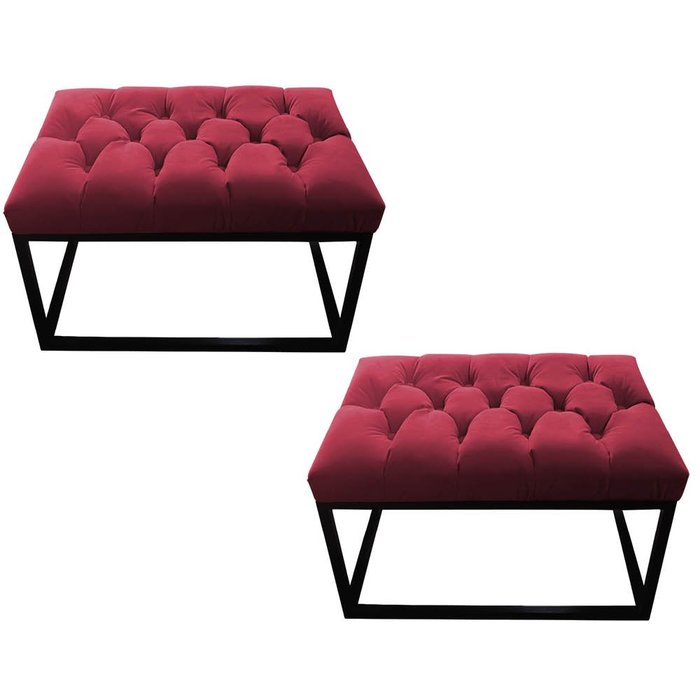 Kit 02 Puff Alpha Capitone Base em Ferro Preto Suede Vermelho - Ruotolo Decor