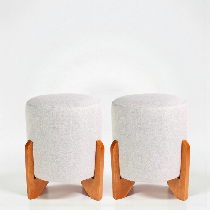 Kit 02 Puff Piave Decorativo Tecido Linho Banqueta Redondo Pés de Madeira Maciça