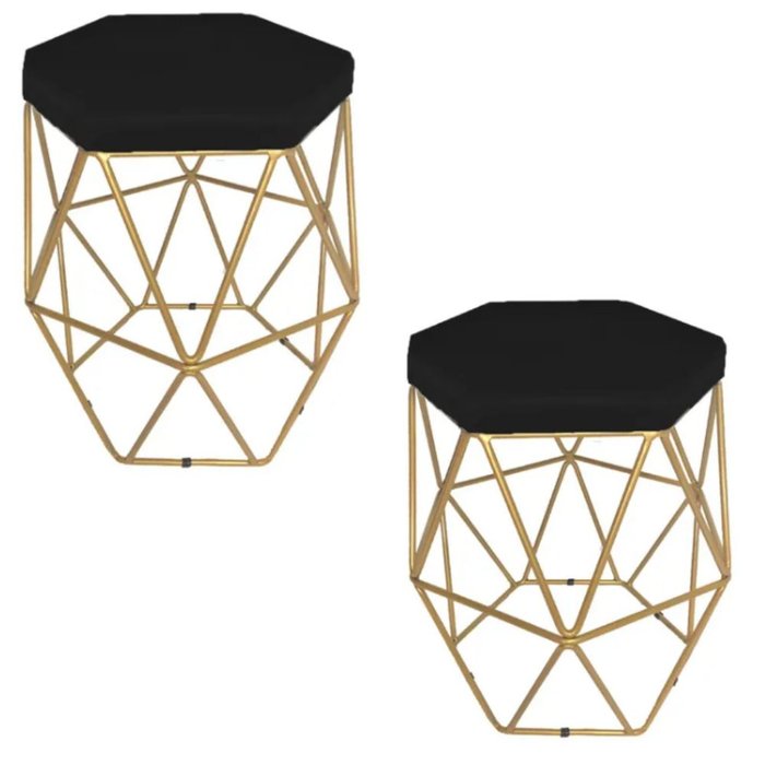 Kit 02 Puffs Decorativos Aramados Hexagonais Zahav Estofados:Dourado - Preto Dourado - Preto