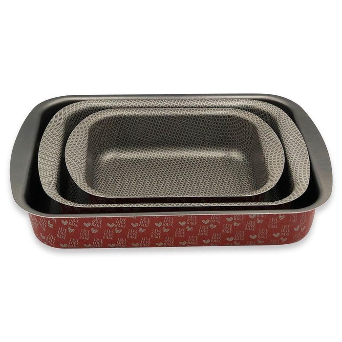 Kit 03 Assadeiras Tamanhos Diferentes Vermelha Antiadente Kit de Assadeiras Antiaderentes com 03 Peças Vermelha ============================================================ Um conjunto de assadeira será uma ótima opção para você manter sua cozinha ainda mais equipada! Graças a sua tecnologia antiaderente será possível fazer as mais diversas receitas de pães, bolos, tortas e o que mais desejar, com total praticidade no uso. A antiaderencia não permite que resíduos dos alimentos grudem no interior da forma, facilita no momento de lavagem e, auxilia na hora de assar. De forma vantajosa, você terá praticidade, harmonização em sua cozinha com formas modernas e sofisticadas. O conjunto possui 03 formas de diferentes tamanhos, desenvolvidas em material leve que permite o fácil transporte no momento de servir e desenformar o alimento. ============================================================ Contém: 03 Unidades Especificações: - Material: Alumínio Antiaderente - Medida Assadeira Pequena: 28cm x 20cm / 240 gramas - Medida Assadeira Média: 34cm x 25cm / 355 gramas - Medida Assadeira Grande: 40cm x 28cm / 450 gramas - Cor: Vermelho ============================================================ Devido à diferença entre monitores e iluminação diferentes, pode haver variação na tonalidade apresentada no anúncio. Medidas muito aproximadas.