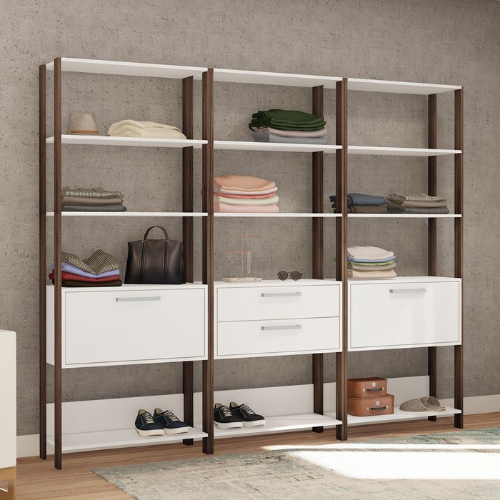 Kit 03 Estantes para Sala com Prateleiras Gavetas e Portas Cor: Branco com Madeirado