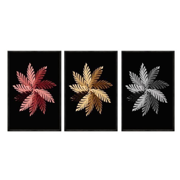 Kit 03 Quadros Decorativos - Floral Coral Dourado e Prata Flnt037 - Tela Canvas - 60x80cm