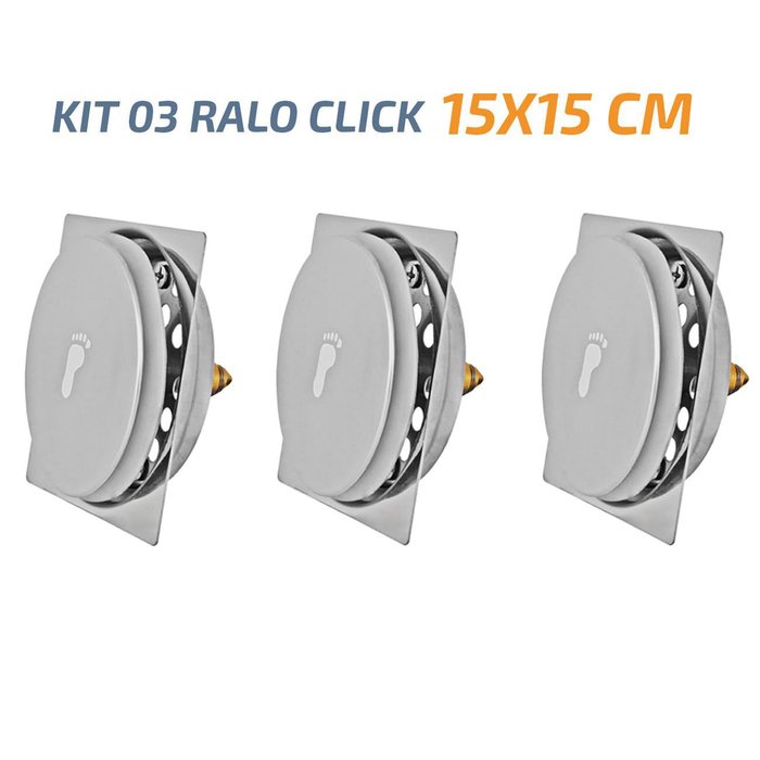Kit 03 Unidades Ralo Click 15x15 Cm Ralo click com sistema abre e fecha, sistema inteligente; Evita que o odor passa para o ambiente; Compátivel com todas as marcas de porta grelha do mercado; Abre e fecha apenas com o pisar; INFORMAÇÕES TÉCNICAS Produto: Ralo Click Quadrado Inteligente 15x15 CM; Dimensões: 15 x 15 CM; Material: Liga de Cobre Inoxidável; Acionamento: Click; Garantia: 03 Meses;