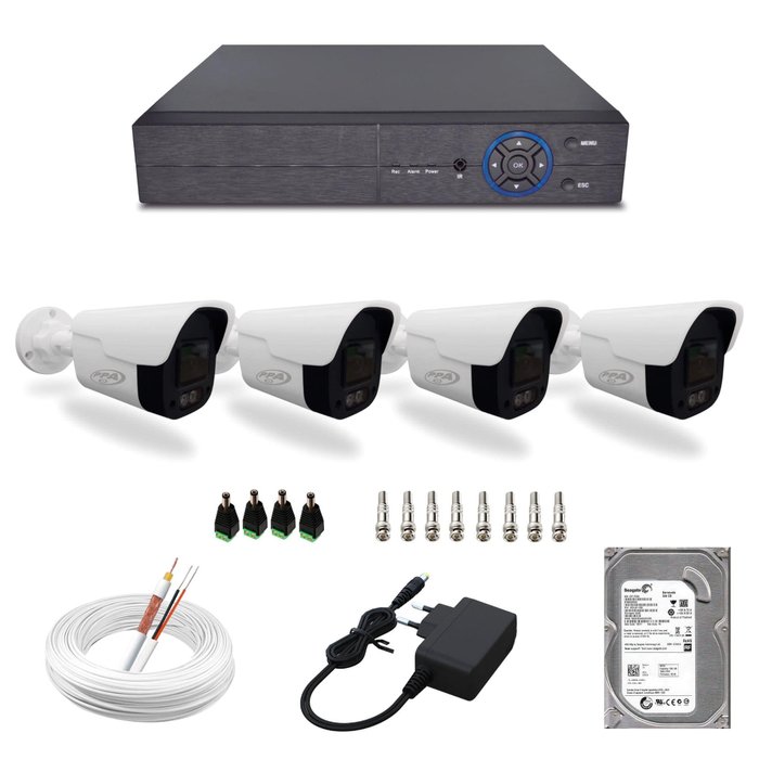 O Kit de câmeras de segurança HD 1080P 2MP da PPA possui um ótimo custo-benefício!Câmera de segurança com tecnologia Jetcolor gera imagens coloridas, em alta resolução, 24 horas por dia. Capta imagens perfeitas em ambientes escuros e tem alcance de até 20 metros através do led branco. Perfeita para ambientes externos de residências, condomínios, empresas, estacionamentos e parques.Já o XVR 04 canais da PPA é o que há de melhor para gerenciamento onde se necessita de alta qualidade, compacto e moderno utiliza compressão de vídeo h.265 o que permite uma melhor utilização do hd, faz gravação contínua, por movimento ou alarme. Tem como interface de operação o painel frontal e mouse o que facilita o manuseio do produto controle de PTZ.Itens Inclusos:01 XVR 04 canais da PPA04 Câmeras de Segurança Bullet Jetcolor Flex HD - PPA01 HD Interno WD Seagate 500GB01 Fonte Garra 1A c/ pino - MCM08 Conectores BNC com mola04 Conectores P4 Macho100 metros de Cabo CoaxialEspecificações da Câmera:• Imagem analógica em alta resolução Full HD (2MP)