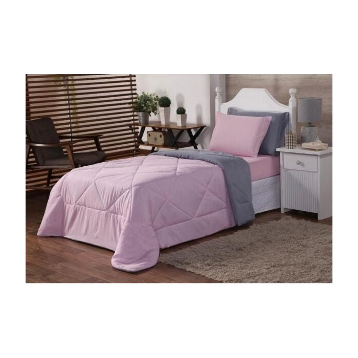 Kit 04 Edredom+Lençol Ternura Dupla Face Solteiro Rosa Cinza