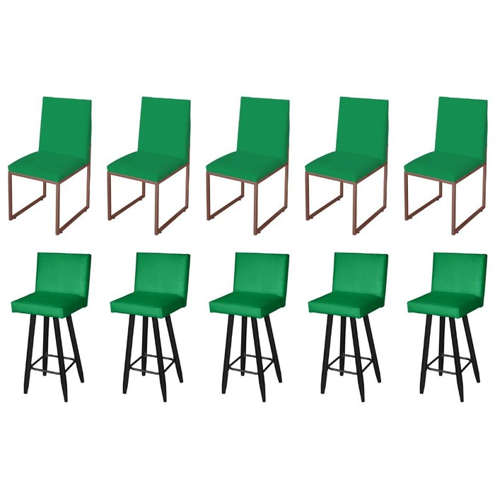 Kit 05 Banquetas Altas Zelensky e 05 Cadeiras Slim Base Bronze Suede Verde - Ruotolo Decor