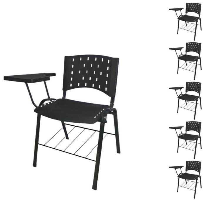KIT 05 Cadeiras Universitárias com Prancheta e Porta Livros - Cor Preto - REAPLAST - 32043