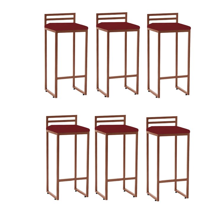 Kit 06 Banqueta Alta Com Encosto Petra Balcão Bar Cozinha Bistrô Ferro Bronze Sintético Vermelho