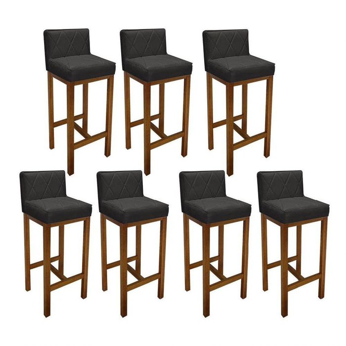 Kit 07 Banqueta Alta Com Encosto Loren Cozinha Base Madeira Carvalho Cinza Cinza