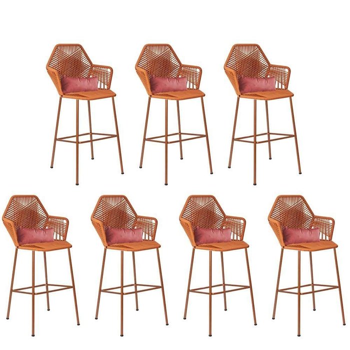 Kit 07 Banqueta Alta Com Encosto Sttar Ferro Bronze Fibra Terracota Almofada Suede Rose Gold