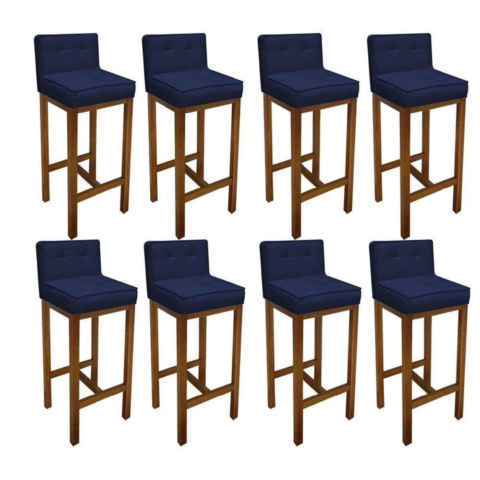 Kit 08 Banqueta Alta Com Encosto Alba Base Madeira Rústico Suede Azul Marinho Azul Marinho