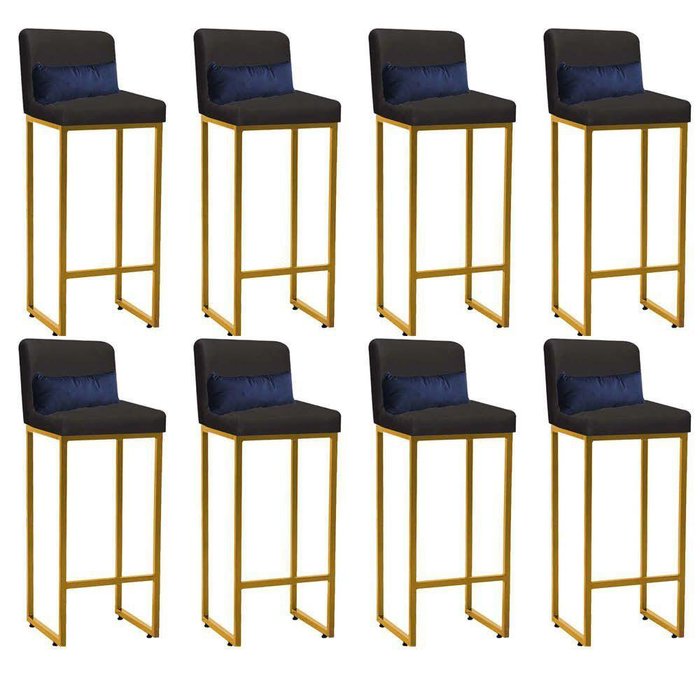 Kit 08 Banqueta Alta Com Encosto Lucca Industrial Ferro Dourado Suede Cinza E Almofada Azul Marinho
