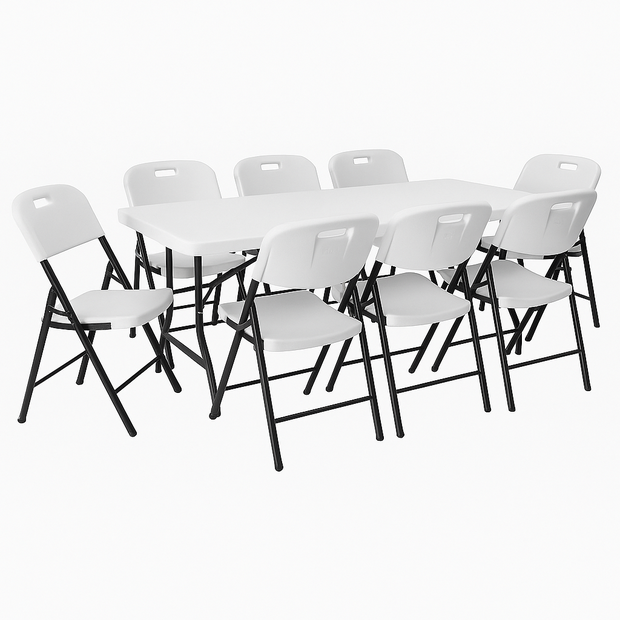 Kit 08 Cadeiras Dobráveis Max Branca com Estrutura Preta e 01 Mesa Dobrável 2 metros Branca