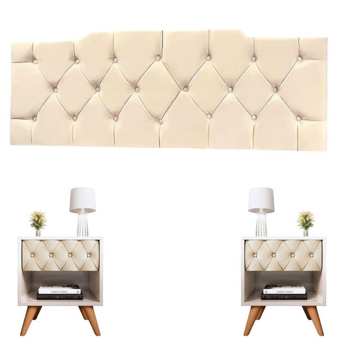 Kit 1 Cabeceira 1.40cm 2 Mesa De Cabeceira Glamur Vitoria Decor Pé Madeira Gaveta Estofada Corrediça Telescopica Cor:off