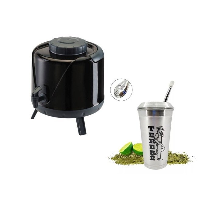 Kit Contém: 01 Garrafa térmica 5 litros tipo Botijão Arezzo com torneira. 01 Copo Cuia de Alumínio Com Tampa e Bomba. ATENÇÃO: Todos os produtos deste kit são originais e acompanham nota fiscal e garanntia. Garrafa: - Essa garrafa térmica é perfeita para você sempre ter água e um delicioso suco bem fresquinho à disposição. Indispensável para seus momentos de lazer e descanso, desde lugares simples para tomar um delicioso Tereré, na beira da piscina ou na praia, e levar para seus esportes preferidos. Além de ter grande resistência para momentos aventureiros como camping e pesca. - Mantém as bebidas com gelo por até 12 horas, e bebidas quentes por até 4 horas. - Seu lindo design é moderno, versátil e com textura lisa e brilhante. - Possui torneira dosadora que facilita a forma de servir a bebida e garante que a garrafa esteja sempre fechada, evita vazamentos e a entrada de poeira e insetos. - Por ter capacidade de 5L e excelente qualidade térmica, pode servir também como cooler, possuindo espaço para aproximadamente 5 latinhas dentro da garrafa. - Conta com uma grande abertura através de uma tampa na parte superior, que facilita na limpeza e na colocação de grandes pedaços de gelo. - Apresenta alça e pézinho retrátil, facilitando o transporte e para se servir. - Material feito a partir de plástico de alta durabilidade, Poliuterano e 100% livre de Bpa. - Superfície lisa e de fácil limpeza. Dimensões: - Altura (sem pezinho ativado) 22cm x largura 24,5cm. - Altura (com pezinho ativado) 28cm x largura 24,5cm. - Abertura superior: 11,5cm. - Peso: 800g. Cuia: Essa cuia é para você que é amante de tereré, o produto é perfeito para o seu dia-a-dia. Pode ser usada facilmente para o consumo da erva mate gelada em qualquer lugar, inclusive ao ar livre, em baixo de uma árvore, pois sua tampa protege das folhas que possam cair - Conserva a temperatura por mais tempo. - Fácil de limpar e não quebra. - Copo estiloso com material de excelente qualidade e durabilidade, bem cuidado ele irá durar por muito tempo. Dimensões: - Copo com tampa: 14 x 8 cm - Bomba: 19 x 3 cm