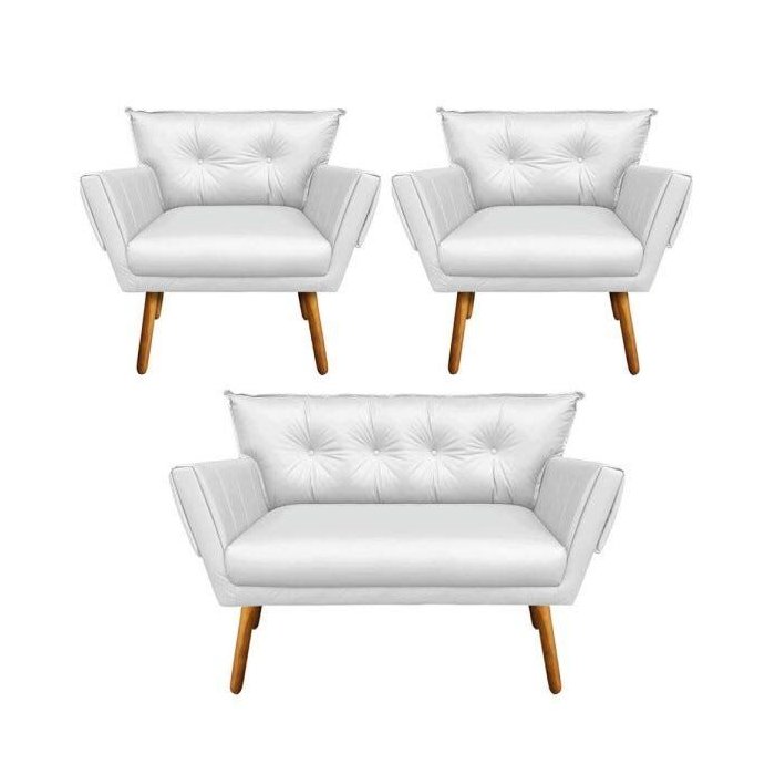 Kit 1 Namoradeira e 2 Poltronas Anitta Corino Pés Palito Castanho D'rossi - Branco Branco