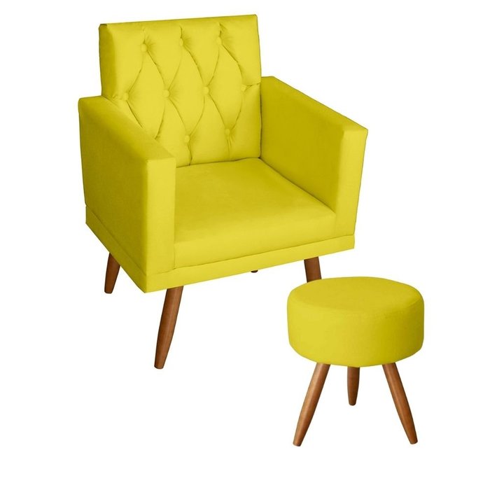 Kit 1 poltrona Para sala de Estar Bianca Capitonê Rodapé e 1 Puff Redondo Suede Amarelo - Móveis Amarelo