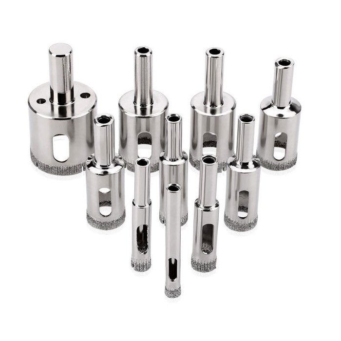 Kit com 10 brocas diamantadas de corte circular revestidas. Fura um círculo completo de vidros, mármores, granitos, espelhos, garrafas, pisos, azulejos, cerâmicas e madeiras.
