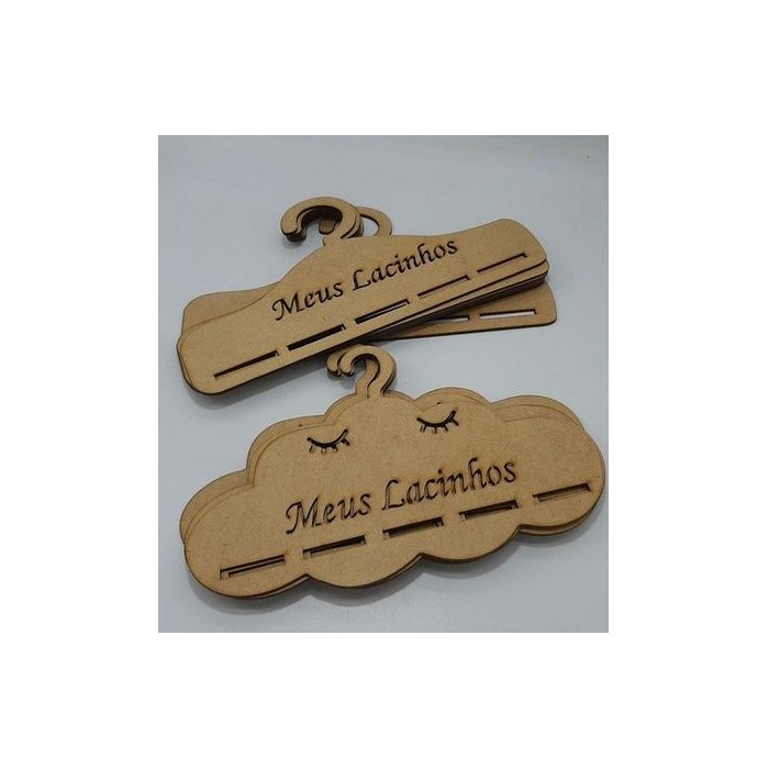 Cabide Porta Laços/ Lacinhos MDF - Kit com 10 unidadesEste Kit contém:5 Cabides MDF Cru o em formato Nuvem , escrito "Meus Lacinhos", com espaçamento de 5 aberturas de 4cm cada para aplicação de Fita de Cetim para pendurar os Laços.Medidas 27 x 17 cm+5 Cabides MDF Cru o em formato Reto , escrito "Meus Lacinhos", com espaçamento de 5 aberturas de 4cm cada para aplicação de Fita de Cetim para pendurar os Laços.Medidas 30 x 15 cm* Produto em madeira MDF CRU, sem pintar (como na foto do anuncio).Espessura: 3 mmNão acompanha Fita de Cetim e Laços.Produto de excelente qualidade e com ótimo acabamento no Corte no Laser.