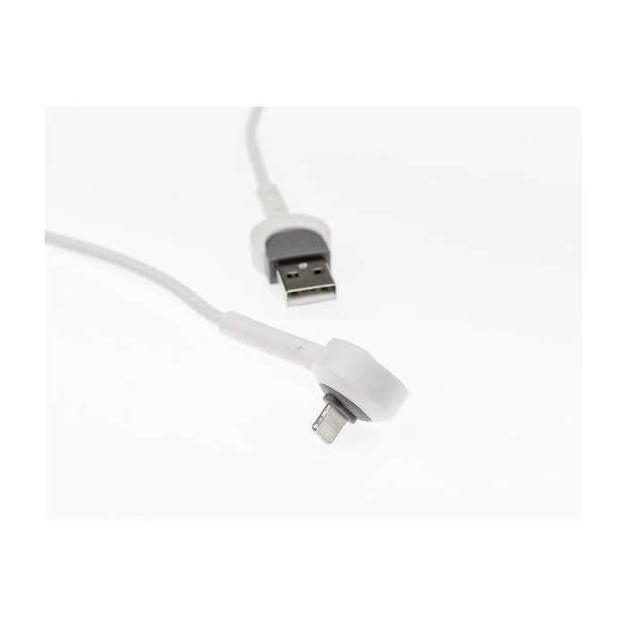 Cabo USB Para iPhone 90 Graus 1 metro branco Comp é utilizado para carregar e transferir dados de iPhone, iPad, para a porta USB 2.0 do computador e para Carregadores de energia USB. O conector 90 graus possui base estendida com função de suporte, permitindo que o aparelho se mantenha inclinado, perfeito para assistir vídeo, chamada de vídeo e leitura de textos Características Técnicas: