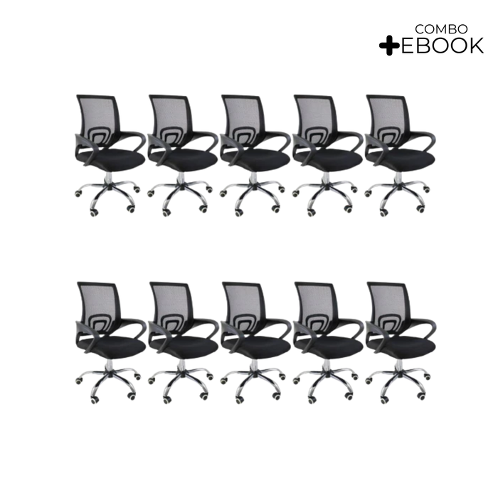 Kit 10 Cadeiras de Escritório Begonia Mesh Ergonômico Preto + E-book