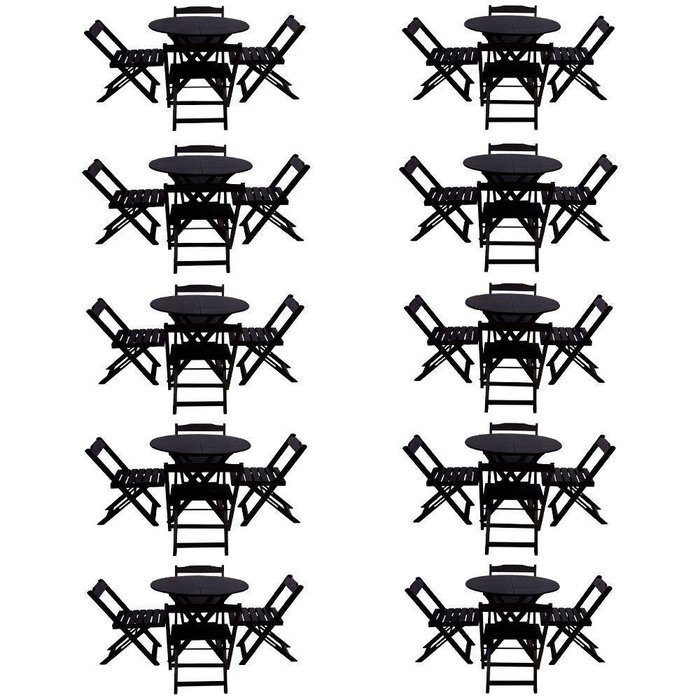 Kit 10 Jogos De Mesa Dobravel Com 4 Cadeiras Tampo Redondo 70x70 PretoKit 2 Jogos De Mesa Dobravel Com 4 Cadeiras Tampo Redondo 70x70 Preto é ideal para bares, restaurantes, estabelecimentos, áreas de lazer e tambem para sua casa. Feito em madeira maciça, tornando resistentes e duráveis. Seu design permite que seja encaixado em qualquer ambiente, trazendo um toque a mais para seu estabelecimento. Além de sua durabilidade, o que lhe trará conforto para servir seus clientes. Por ser dobrável torna-se mais fácil guardar, manusear e limpar o produto.Atenção: EVITE USAR PRODUTOS ABRASIVOS E QUíMICOS PARA LIMPEZA DO PRODUTO, aconselha-se o uso de pano umedecido para melhor conservação; mantenha o produto fora de chuva e sol constantesMESA Cor: Preto Modelo: Dobravel Dimensões: Altura 75cm | Largura 70cm | Profundidade 70cmCADEIRA Cor: Preto Modelo: Dobravel Dimensões: Altura 80cm | Largura 45cm | Profundidade 42cmKit 10 Jogos de Mesa Dobravel com 4 Cadeiras Tampo Redondo 70x70 Preto