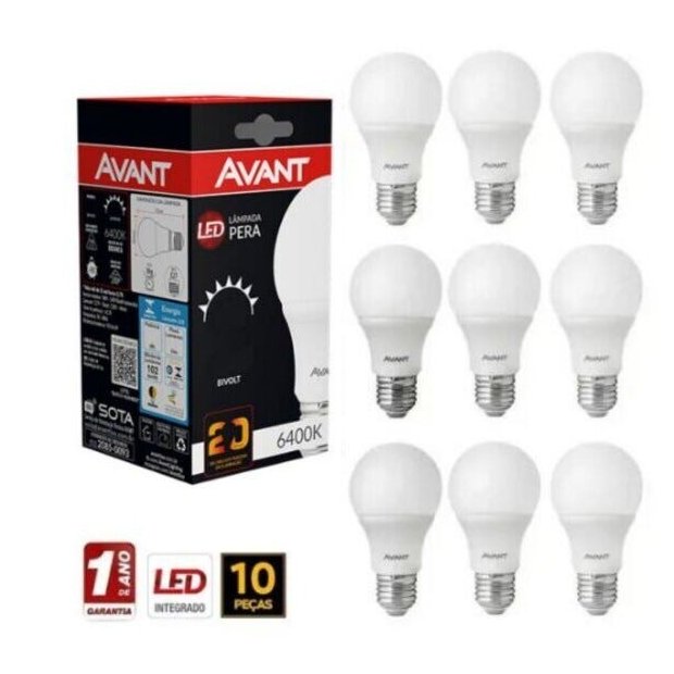 - 10 Unidades Lâmpada Led Pera 7w Avant Branco Frio Avant-Caracteristicas:•Potência: 7W•Temperatura de Cor: 6500K•Dimerização: Não Dimerizável•Índice de Proteção: IP20•Fluxo Luminoso: 630lm•Eficiência Luminosa: 90lm/W•IRC: >80•Base: E27•Garantia: 1 ano-Propriedades:›Corpo em policarbonato branco e difusor em›policarbonato leitoso.›Disponível na temperatura de cor 6500K• A linha de lâmpadas Pera LED da Avant é referência na iluminação dos ambientes. Com objetivo de aumentar ainda mais a gama de opções, a linha Pera LED 7W de bivolt volts oferece uma iluminação com a mesma qualidade das lâmpadas LED tracionais e com a vantagem de poder ser instalada em ambientes específicos de trabalho ou lazer com alimentação 110/220 volts.• Sugestões de uso: Ambientes internos de embarcações, aeronaves, trailers e food trucks.Dados Tecnicos:- Dimensões(LxA): 60x112mm- Peso: 50g- Marca: Avant- Código do Fabricante: 195071377- Ean: 7899825505264