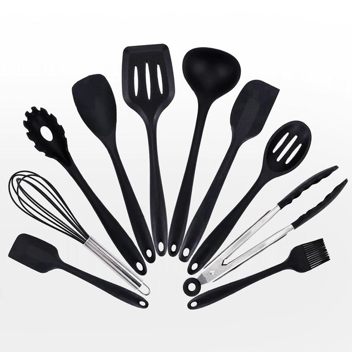 Kit 10 Utensílios Cozinha Silicone com Pegador e Fue - Preto