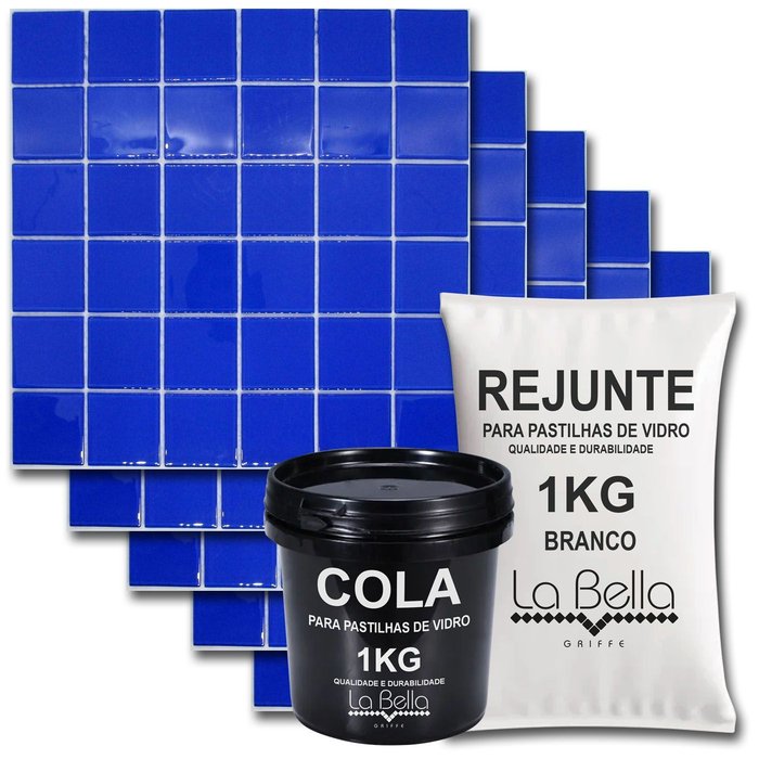 Kit 11 Pastilhas de Vidro Azul+cola+rejunte Branco Azul