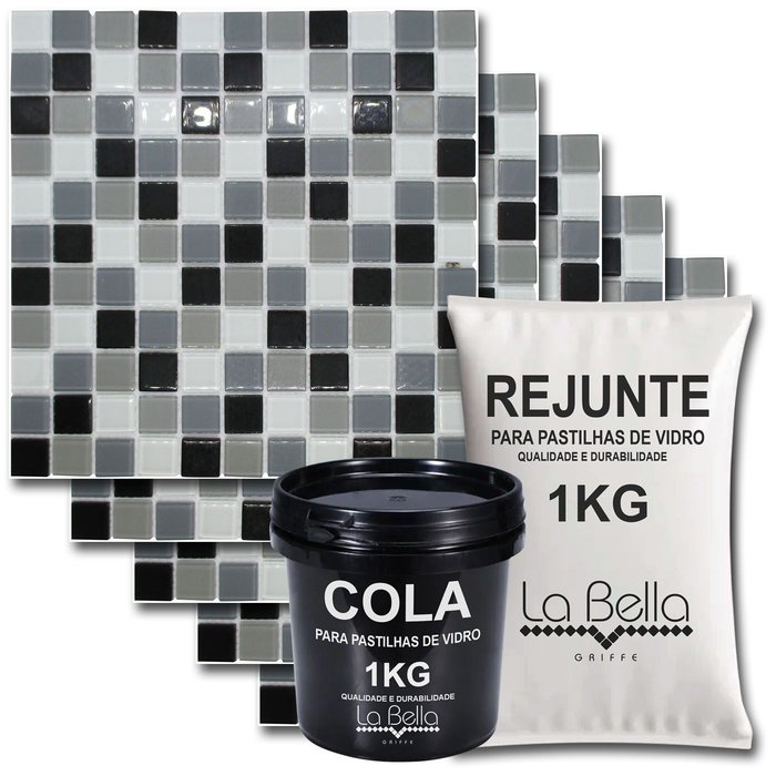 O Kit 11 Pastilhas de Vidro cinza Mix Brilhante é ideal para e torna fácil revestir banheiros, cozinhas, churrasqueiras e piscinas, em áreas internas e externas, secas e molhadas. Cada placa possui 5mm de espessura, O Kit cobre em média 1 metro (0,99m²) no total. Acompanha 1kg de cola e catalisador para fixação segura, com qualidade duradoura, além de rejunte acrílico branco 1kg, resistente a umidade e fungos. Fácil aplicação, secagem rápida e acabamento sofisticado com bordas biseladas.