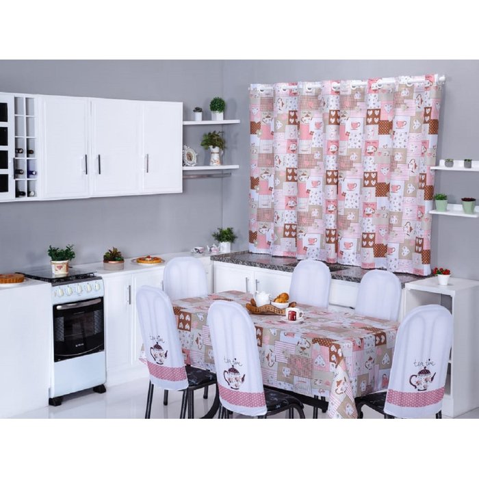 Kit 12 Capas de Cadeira + Toalha de Mesa + Cortina Sala de Jantar Cozinha Dos Sonhos Completa Bule R