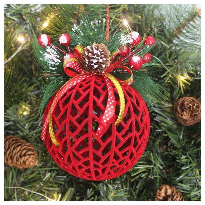 Kit 12 Enfeites Bola Vazada Árvore Natal Camurça Vermelha 16cm Única