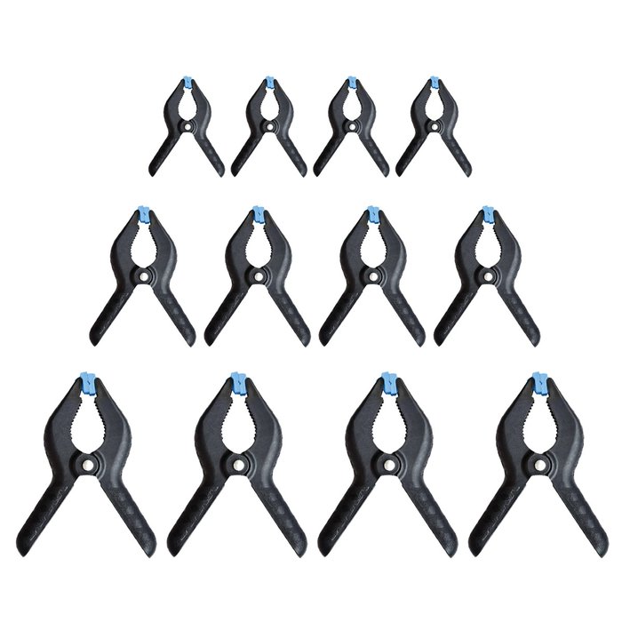 Kit 12 Grampos Sargento 2 a 4Pol. Reforçado Marceneiro Kit 12Grampos Sargento, sendo 4 grampos 2Pol., 4 grampos 3Pol. e 4 grampos 4 Pol. Ideal para mobilização de objetos em superfícies planas ou bancadas, prender no momento de furar, serrar, colar ou parafusar. - Marca: Rayco - 4 Grampos 4Pol. (100mm) - 4 Grampos 3Pol. (75mm) - 4 Grampos 2 Pol. (50mm) - Composto em fibra de nylon - O grampo é resistente à ferrugem e leve - Punhos texturizados para manter firme ao segurar - Super resistente e leve - Garante ótimo auxílio para a fixação de produtos - Ideal para mobilização de objetos em superfícies planas ou bancadas, prender no momento de furar, serrar, colar ou parafusar. - Garantia: 90 dias