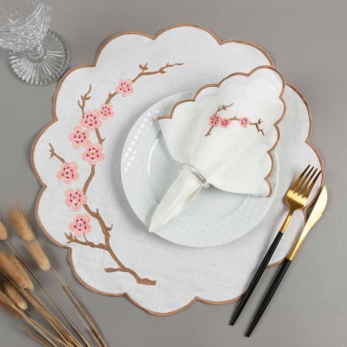 Kit 12 Jogos Americanos Guardanapos De Mesa Redondo Bordado Cerejeira - Branco