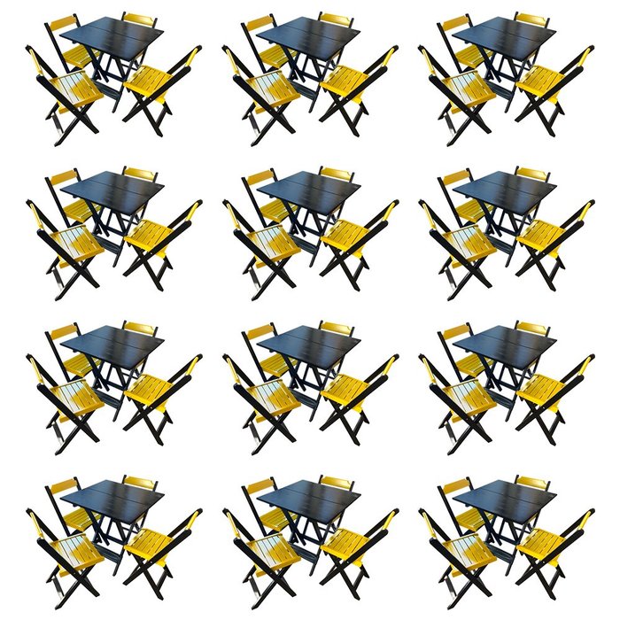 Kit 12 Mesas de Madeira Dobrável Preto 70x70 com 4 Cadeiras Dobráveis Amarelo