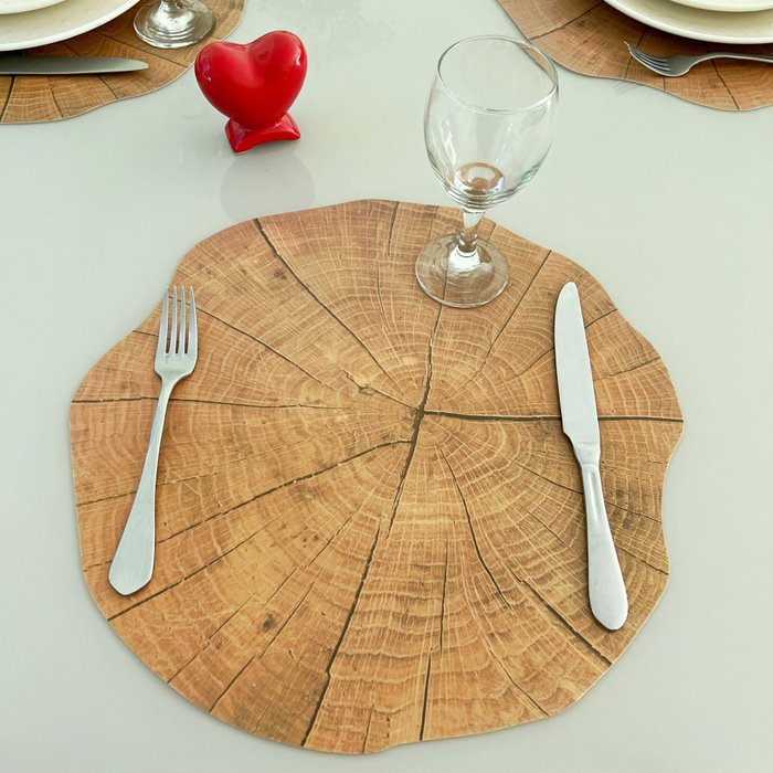 Este jogo americano assemelha-se ao formato do tronco de árvore, porém é todo em plástico, o que facilita sua limpeza. Também proporciona um contraste charmoso harmonizando-o com outros elementos de sua decoração.