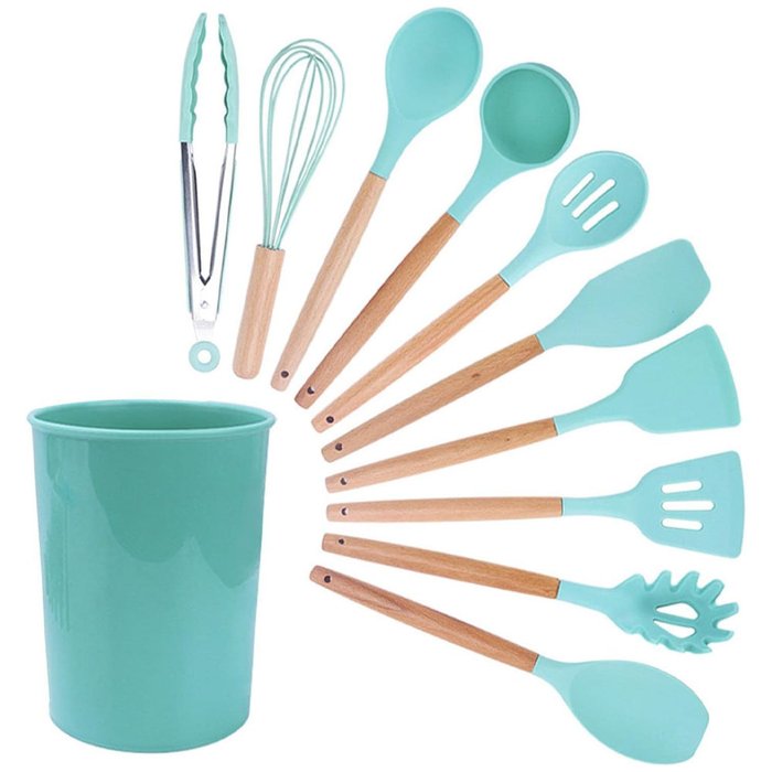 Kit 12 Peças Jogo de Cozinha Utensílios Talheres Silicone com Cabo de Madeira Verde