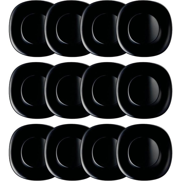 Kit 12 Pratos Rasos 27cm Vidro Opalino Lyor Quadrado Carine Black Brilhante Mesa Posta