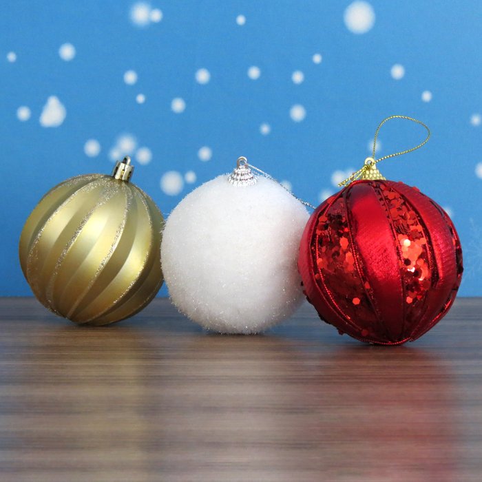 Ricas em detalhes e acabamento impecável com muito brilho e textura, são 3 modelos cuidadosamente selecionados para deixar sua Árvore de Natal com uma decoração única e sofisticada. O Branco com Vermelho é uma tendência na decoração natalina para este ano, e cria um ambiente com muita elegância. O Dourado simboliza a Prosperidade. Feitas em Poliresina, são bastante resistentes, e não há riscos de se quebrarem numa eventual queda ao chão.