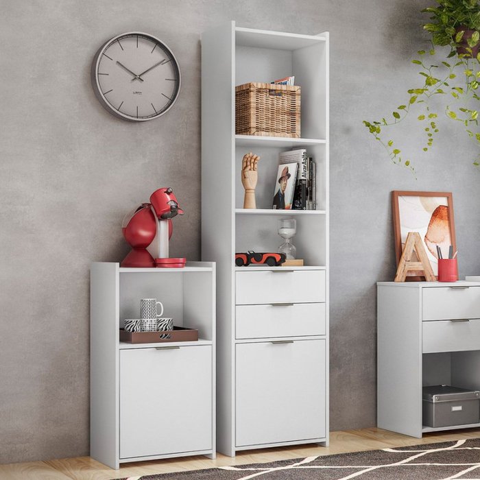 Uma opção para quem procura armários modernos para manter os livros e objetos de decoração sempre organizados! São dois módulos que se compõe da maneira que você precisar. O multiuso mais alto possui duas gavetas com corrediças metálicas, e a porta pode ser fixada onde você preferir: na parte superior, ou na parte inferior do armário. Uma composição que vai deixar seu local de trabalho ou estudos mais prático e cheio de estilo.