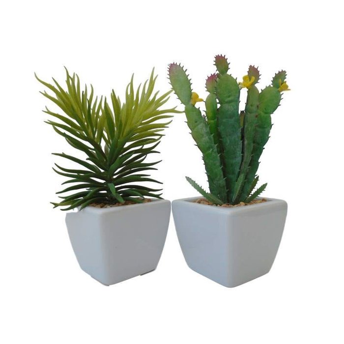Mini arranjo de cactos ou suculentas em vaso de cerâmica na cor branca é a escolha perfeita.