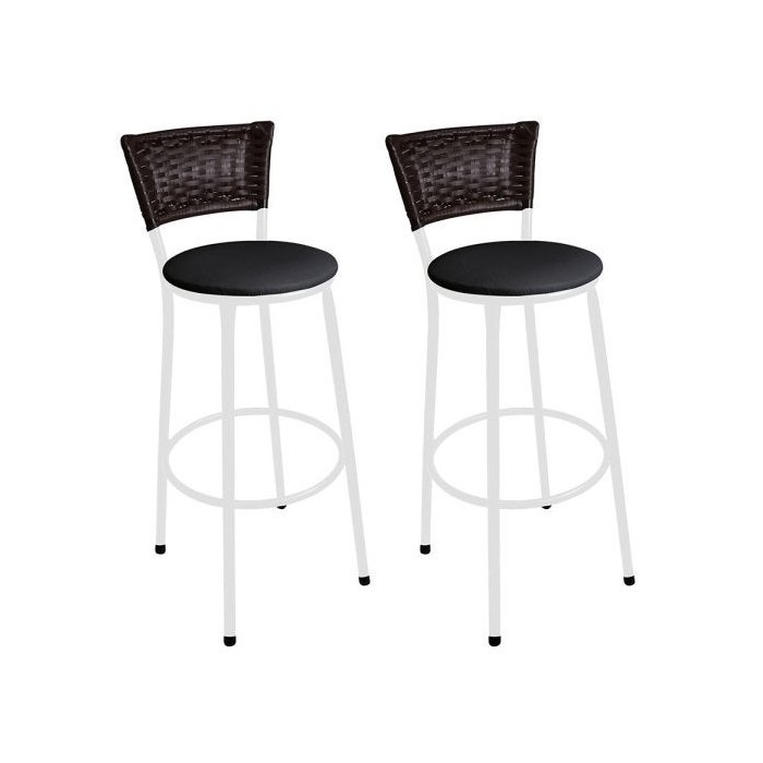 Kit 2 Banco Alto Hawaii Bistrô Encosto Junco Marrom Pintura Epóxi Aço Branca Assento Preto